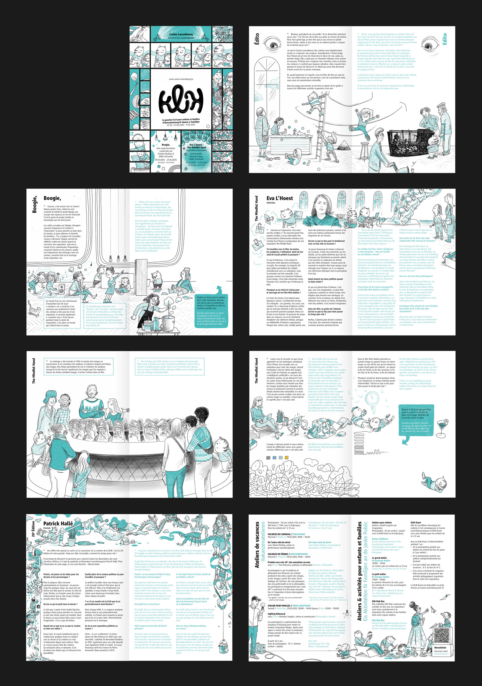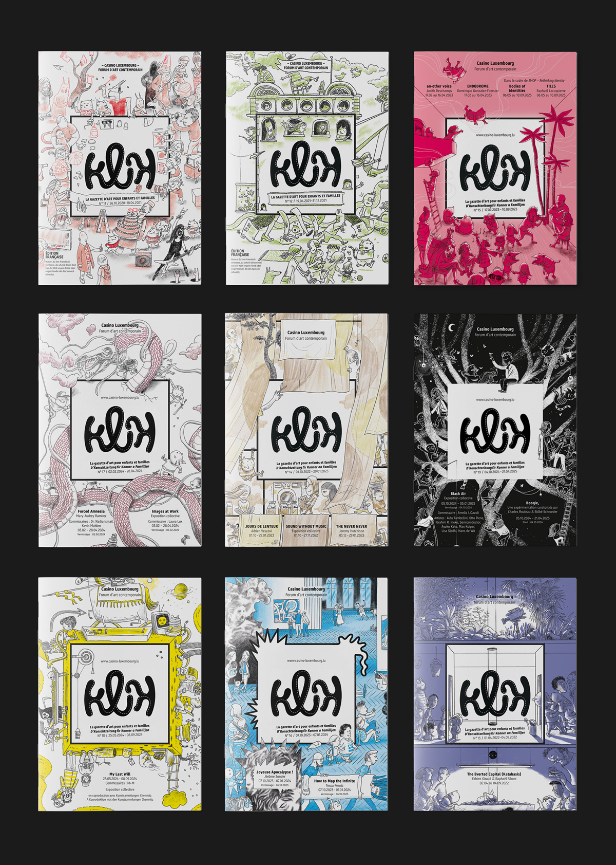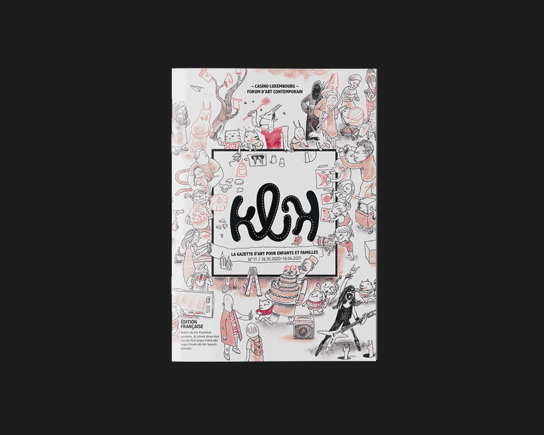 Illustrations and layout for Klik, a children’s magazine published by the Casino Luxembourg museum. The visual concept is built around the magazine’s three cat mascots, who interpret themes from the current exhibitions in a playful and interactive way. Each issue becomes a detailed hidden picture puzzle filled with references to the museum, the ongoing exhibition, workshops, and participating artists. The magazine is completed with a series of exhibition related assignments that children can draw or write directly into Klik.