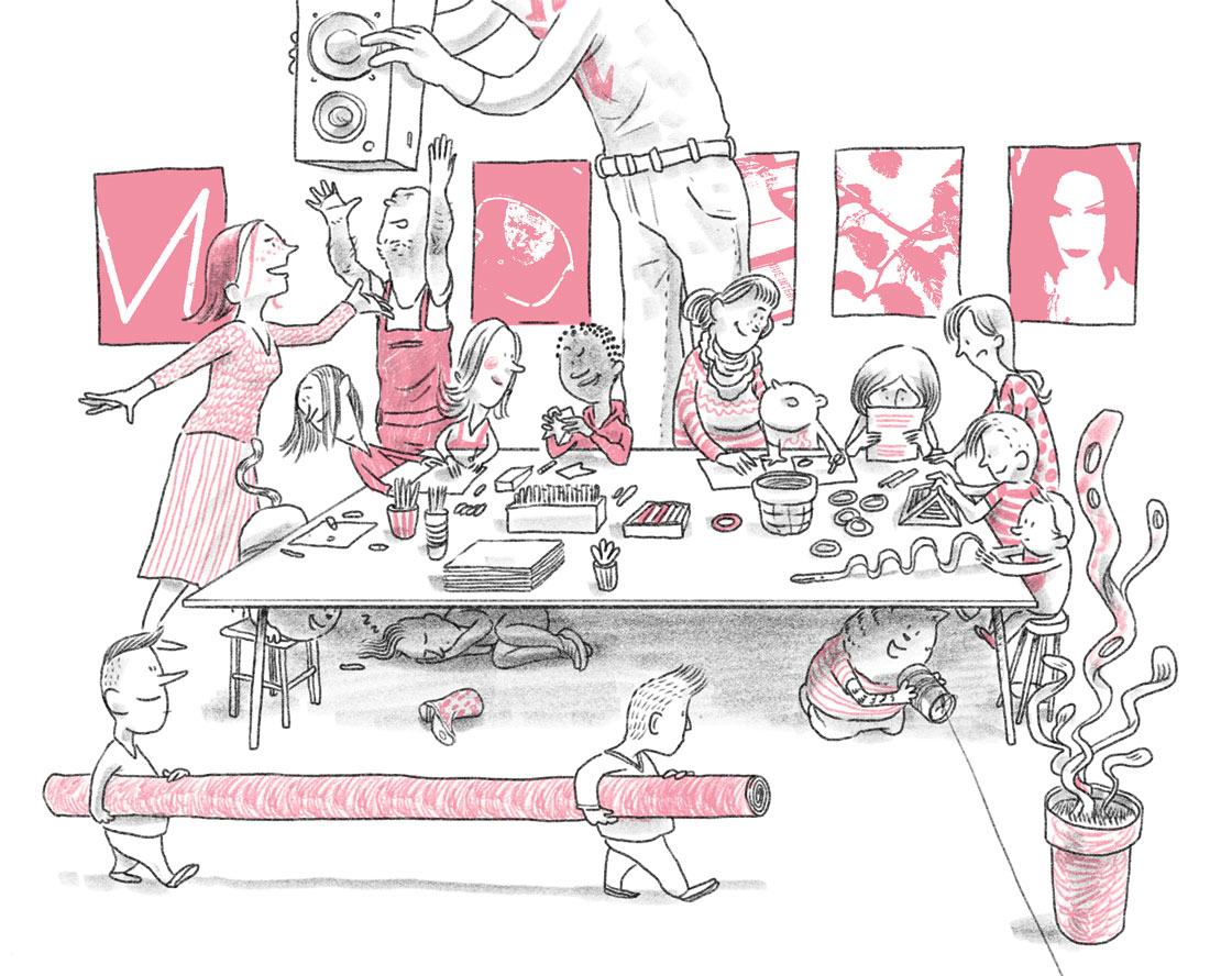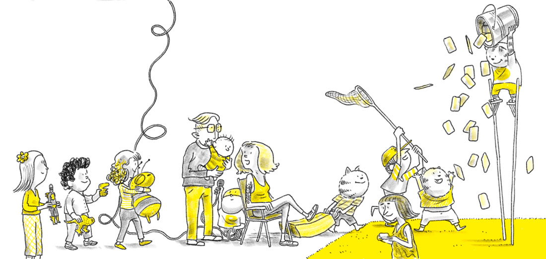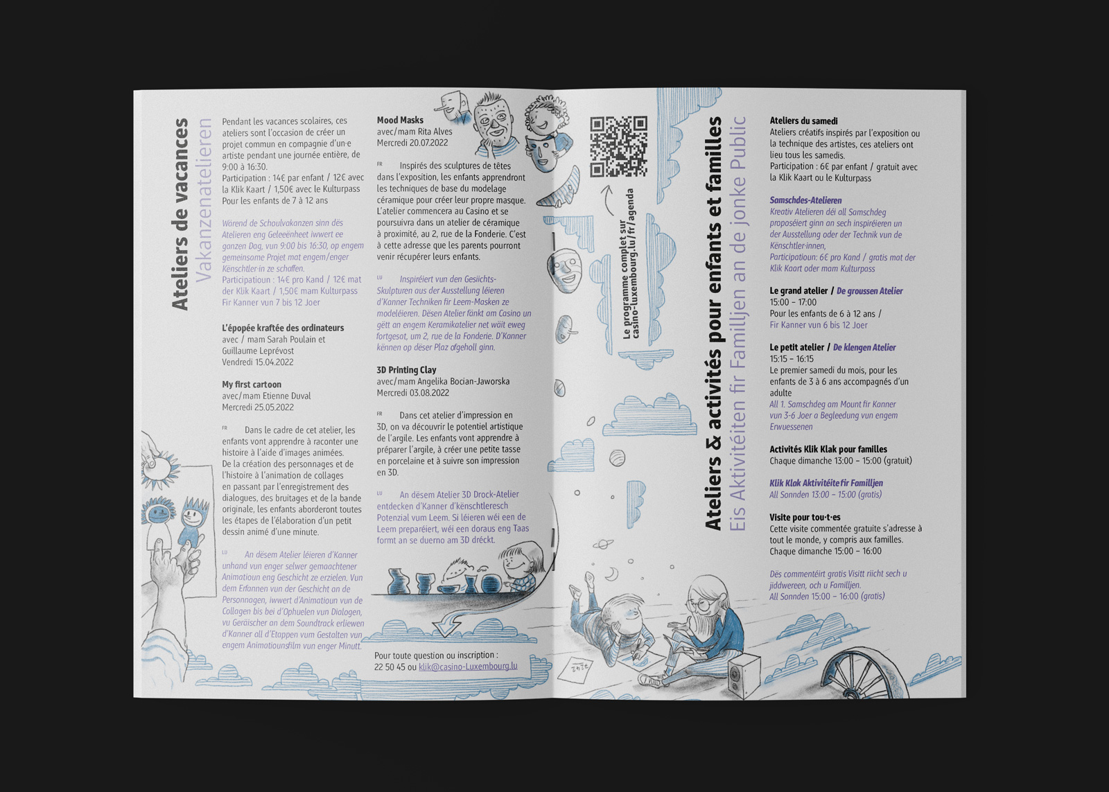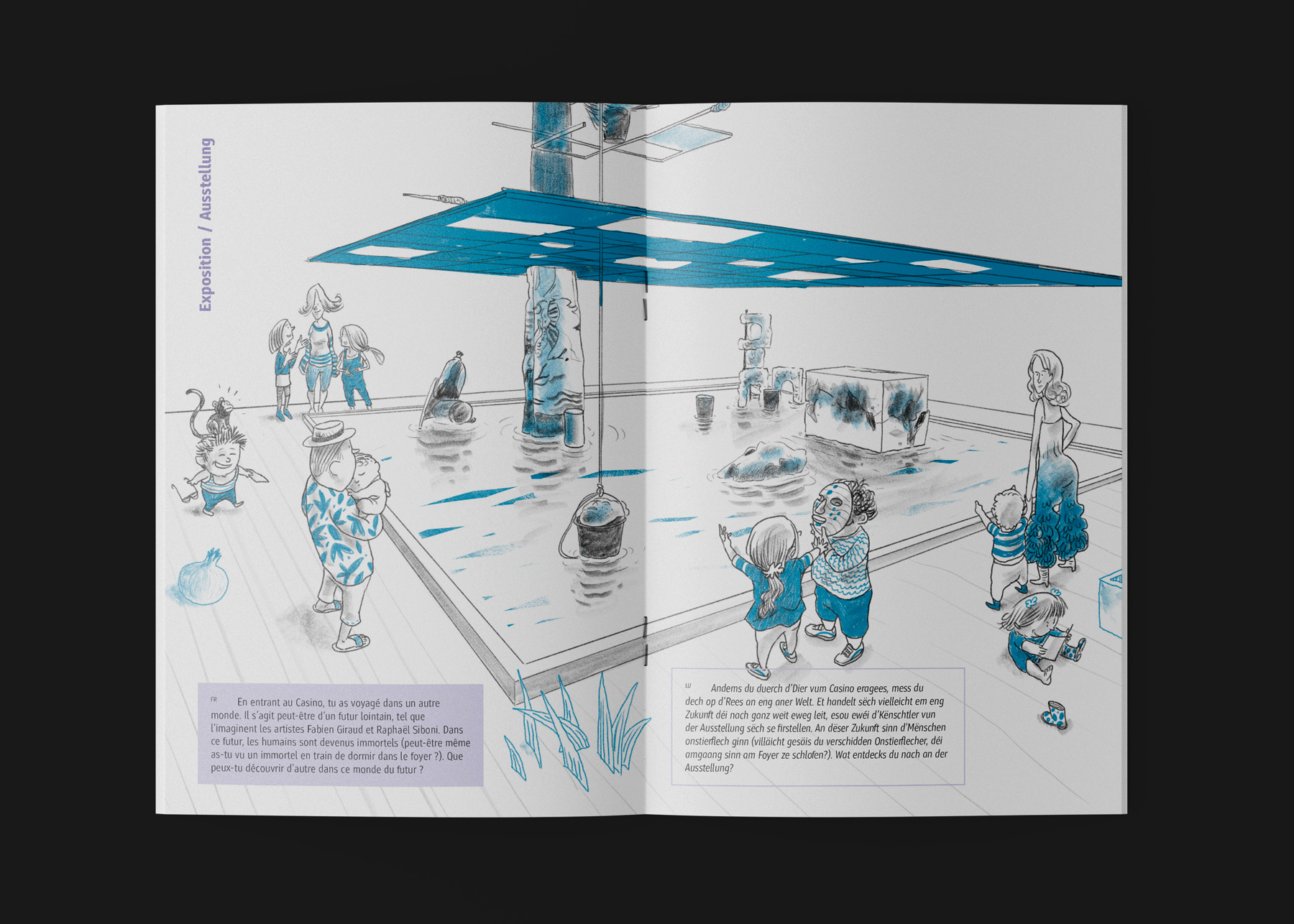 Illustrations and layout for Klik, a children’s magazine published by the Casino Luxembourg museum. The visual concept is built around the magazine’s three cat mascots, who interpret themes from the current exhibitions in a playful and interactive way. Each issue becomes a detailed hidden picture puzzle filled with references to the museum, the ongoing exhibition, workshops, and participating artists. The magazine is completed with a series of exhibition related assignments that children can draw or write directly into Klik.